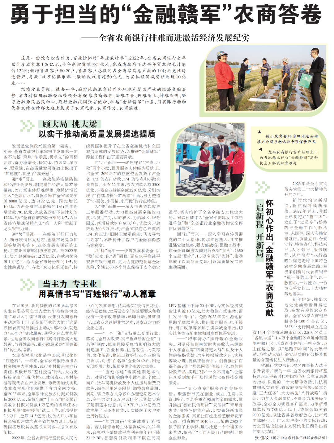 省联社党委书记、提名理事长人选王东升表示:“新的一年,全省农商银行将坚持以习近平新时代中国特色社会主义思想为指导,以党的二十大精神为指引,认真贯彻落实省委、省政府决策部署,聚焦金融‘三大任务’,大力实施‘八行战略’,持续用力加大金融供给,不遗余力服务民生改善,全心全力满足客户需求,力争新增贷款投放785亿元以上、贷款余额突破9000亿元,以让省委省政府放心、让市场主体暖心、让广大客户安心的实际行动,为全面建设社会主义现代化江西作出新的更大贡献。”(来源:2023年1月10日《江西日报》)