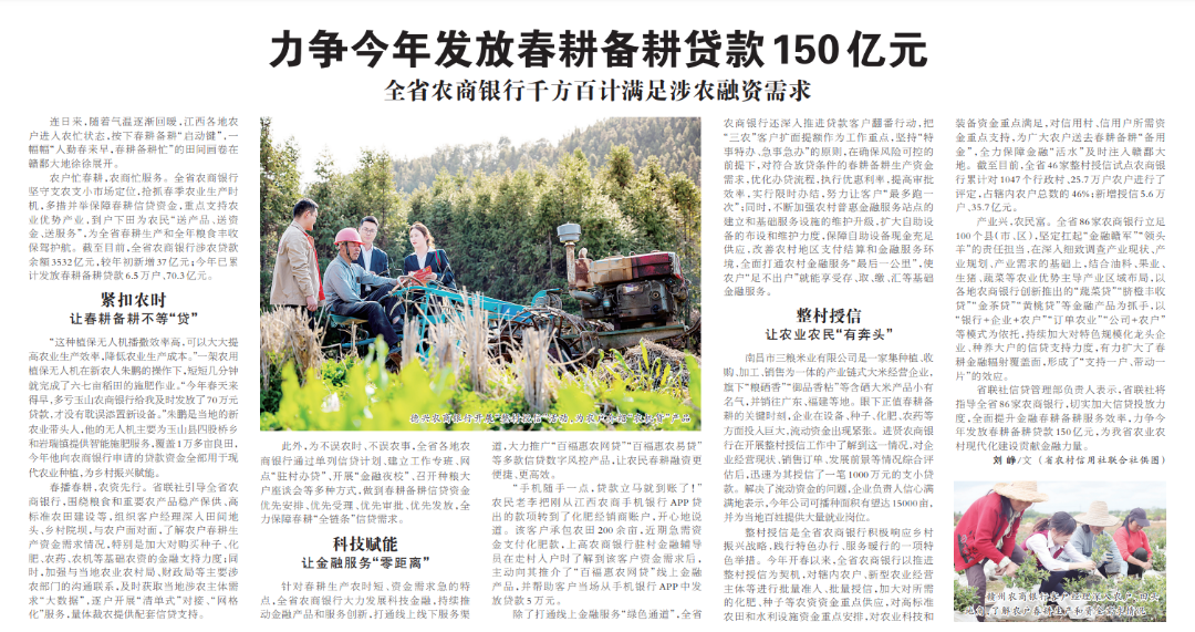 省联社信贷管理部负责人表示,省联社将指导全省86家农商银行,切实加大信贷投放力度,全面提升金融春耕备耕服务效率,力争今年发放春耕备耕贷款150亿元,为我省农业农村现代化建设贡献金融力量。(来源:2023年3月27日《江西日报》)