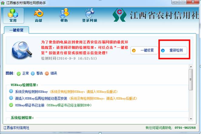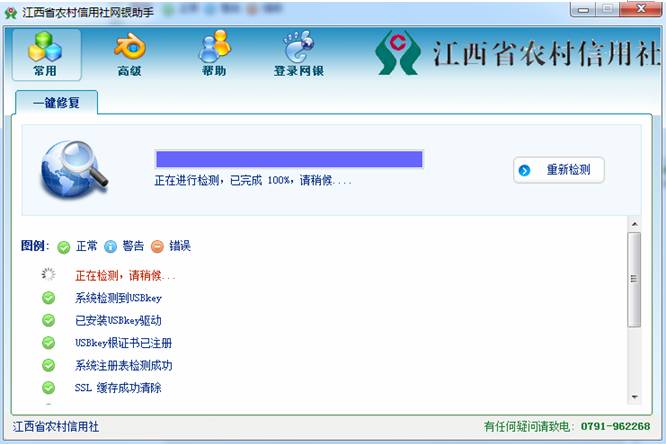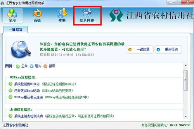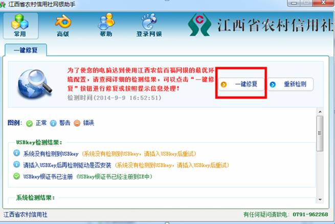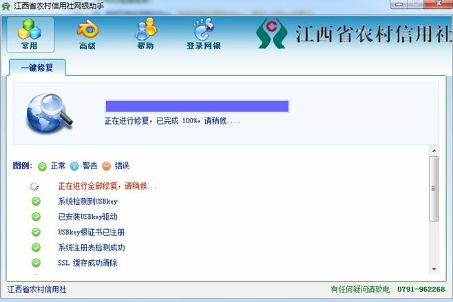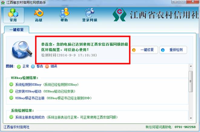 三、运行江西省农村信用社(农商银行)网银助手,点击一键修复,网银助手会自动完成“SSL清空”, “信任站点”, “安装网银盾驱动” 等一系列操作,直到网银助手报“恭喜您,您的电脑已达到使用江西农信百福网银的最优环境配置,可以放心使用!”则表示您已经具备了使用百福网银 USBKEY所有软、硬件的必备环境。
